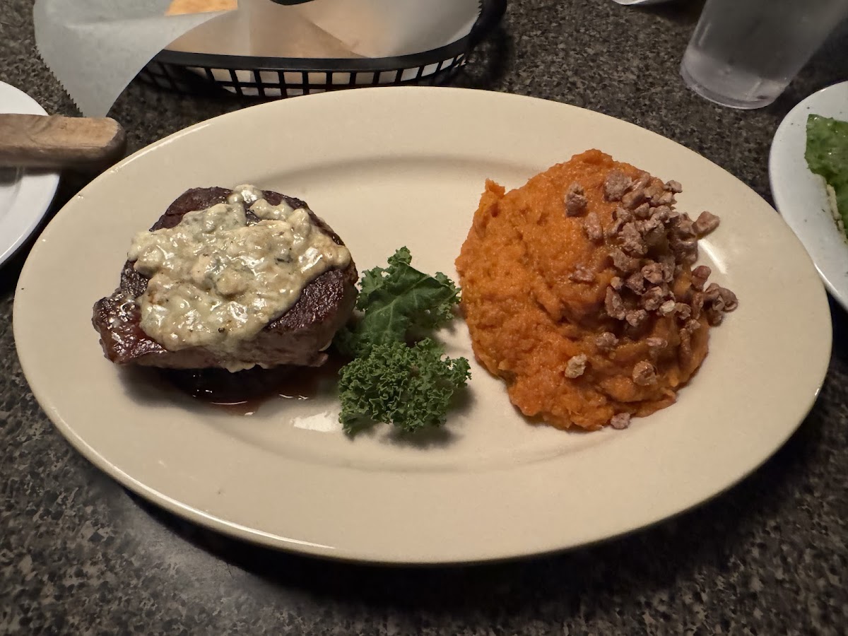 My mother and I were passing through town and decided to try this mom and pop restaurant on our stay. We both ordered the Filet Mignon with Portobello Mushroom and blue cheese and it was excellent. It was perfectly cooked and very tasty. The sweet potato mash and house salad were also standout menu items! Our waiter was also very personable and entertaining. Any question we had that he didn’t know he asked the owner directly who was working last night as well. Service was prompt and the staff looked genuinely happy with their job. Many of them hugging one another and exchanging banter like a family. What a great atmosphere! If we are ever are in town again we will definitely stop by. Thank you for a great experience.