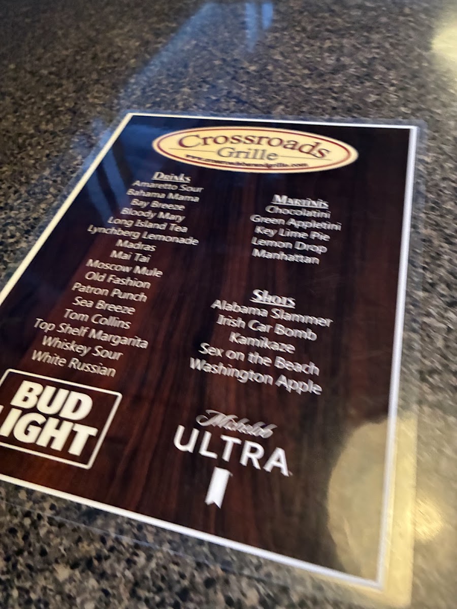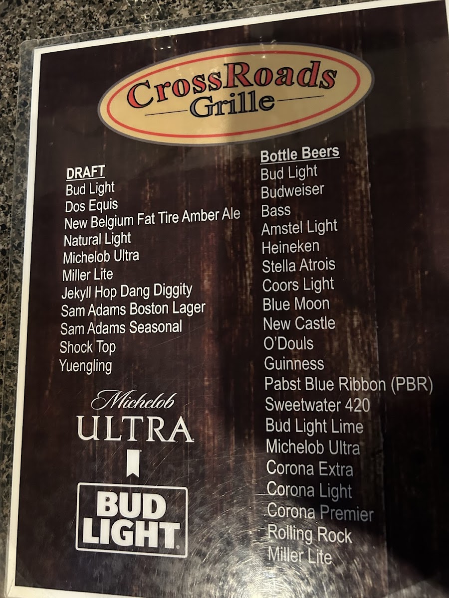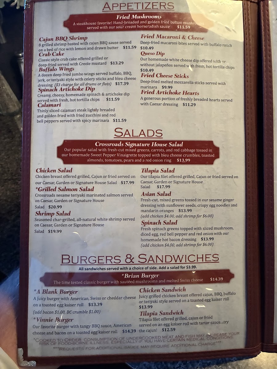 This menu reflects the welcoming, steady pace of Crossroads, where meals are crafted to feel like a moment of honest, enjoyable comfort. Whether sharing a meal with family or gathering with friends, the food and drinks support a warm, easygoing dining experience.