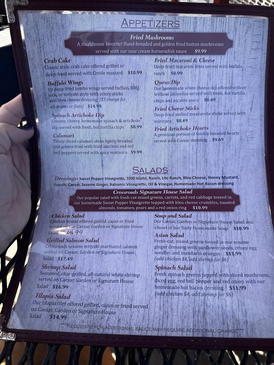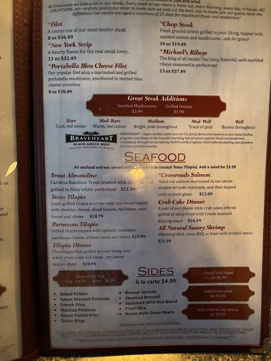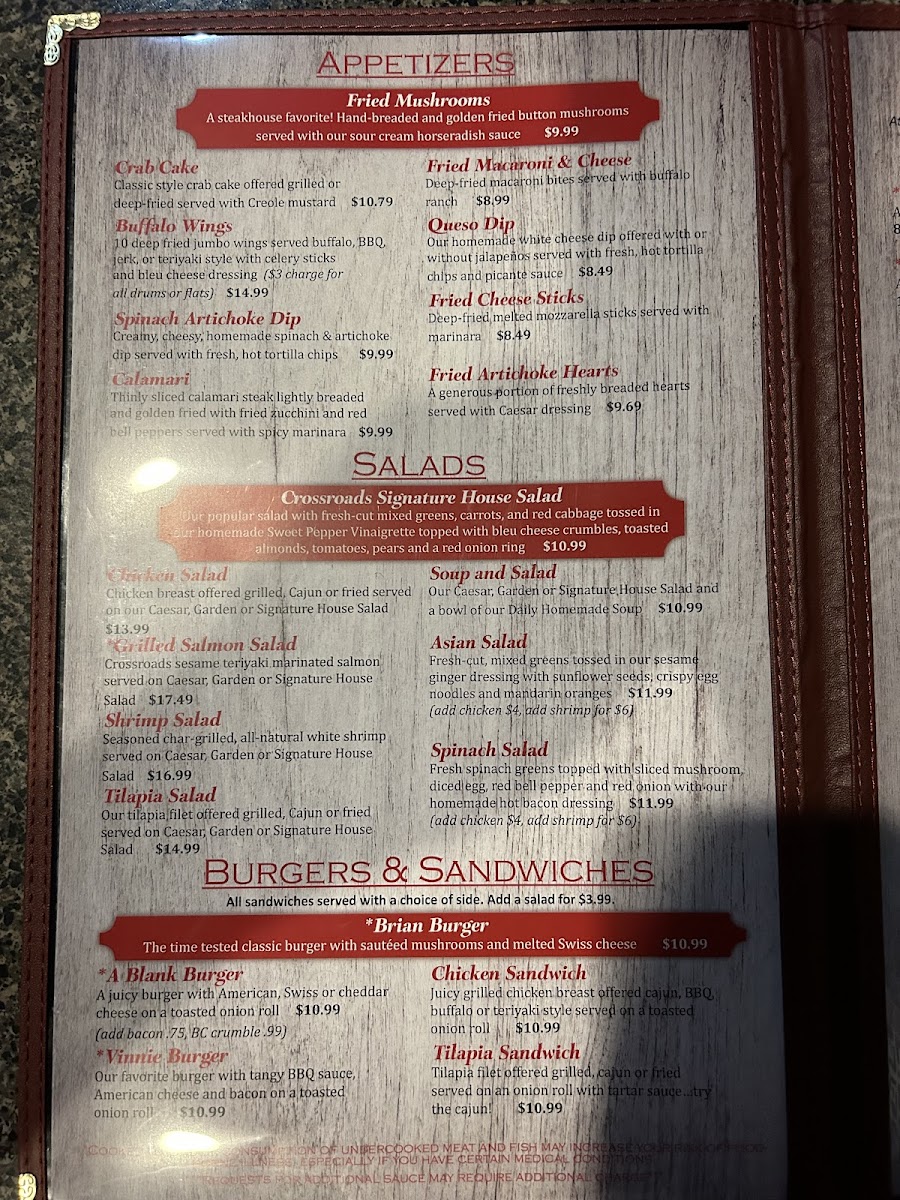 This menu reflects the welcoming, steady pace of Crossroads, where meals are crafted to feel like a moment of honest, enjoyable comfort. Whether sharing a meal with family or gathering with friends, the food and drinks support a warm, easygoing dining experience.