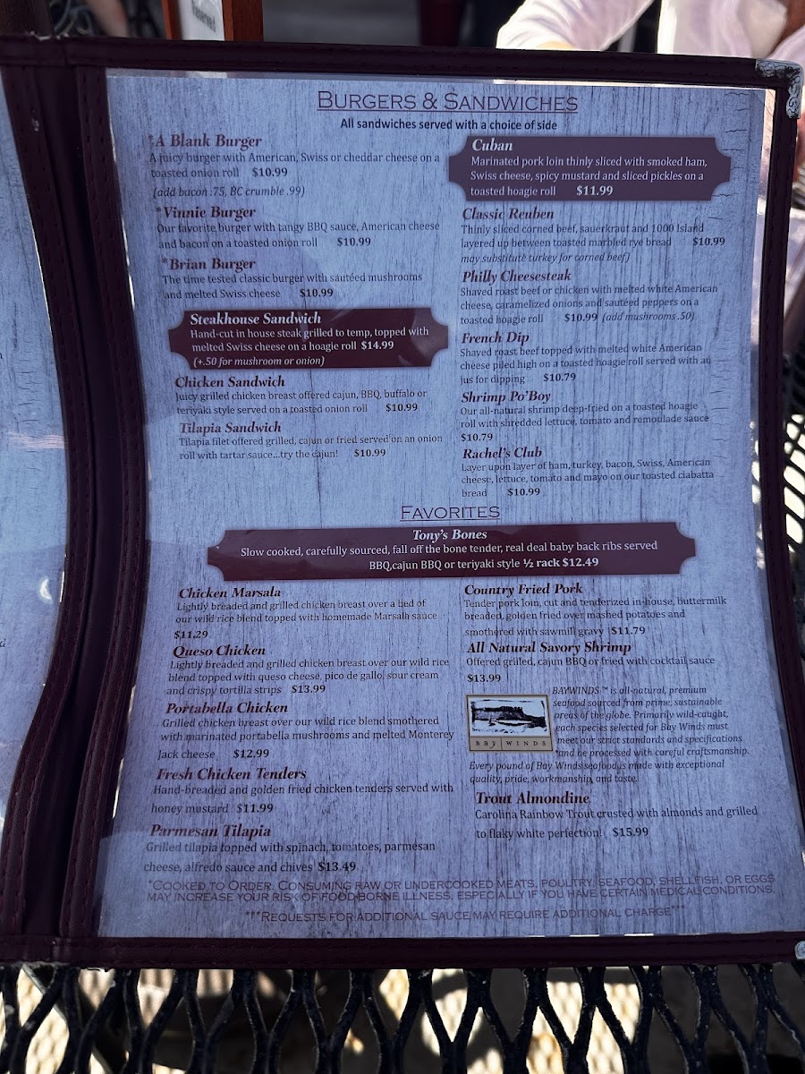 You’ll find comforting appetizers like jumbo wings and creamy spinach artichoke dip, alongside fresh salads and house specialties such as the Delmonico steak and slow-roasted prime rib. Lighter fare like the Chicken Sandwich or Salmon Caesar Salad fits well for a midday meal, while dishes like Ribs Two Ways or Blue Cheese Covered Filet Mignon create a satisfying experience for those lingering over dinner.